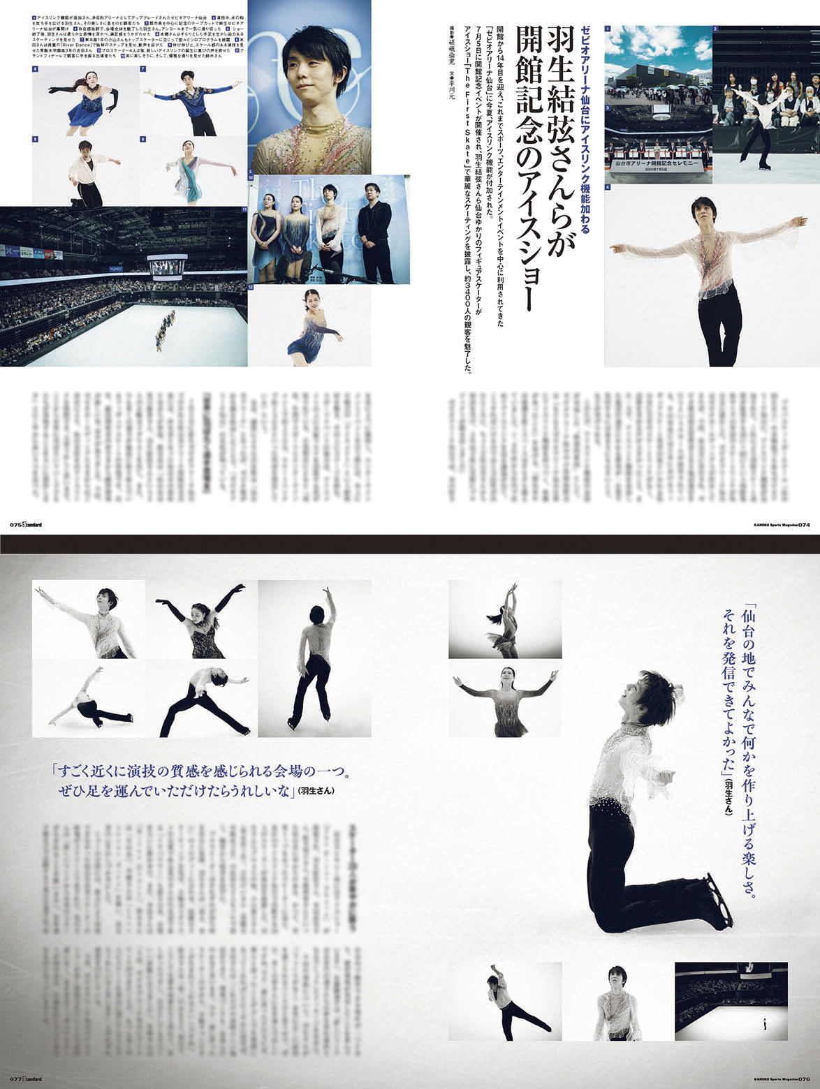 羽生さんら開館記念アイスショーこの夏、ゼビオアリーナ仙台にアイスリンク機能が追加され、国際規格サイズの常設のスケートリンク「仙台市アリーナ」が誕生しました。開館を記念して行われたアイスショーには、仙台市ゆかりのプロスケーター羽生結弦さん、本田武史さん、鈴木明子さん、本郷理華さんのほか、アイスリンク仙台に所属する24人が登場。真新しい氷上で華麗なスケーティングを披露しました。ショーの後の取材で、プロの4人は仙台市にできた新たな練習環境、そして観客に演技を届けられる公演会場としてのアイススケートリンクへの思いを語りました。
